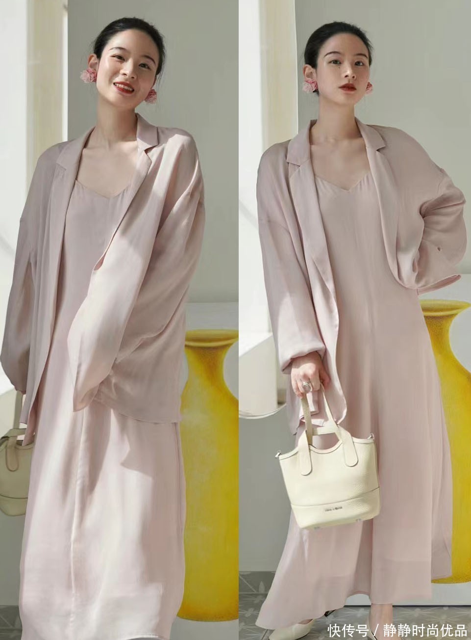 一身同色系的穿搭中,非论外搭或是连衣裙,齐是应用了烟熏玫瑰粉色,既具有一定的柔好意思感,但又不会出现过于俗气的嗅觉,相配的显气质,亦然黄黑皮女士不错添加在穿搭中的色调。