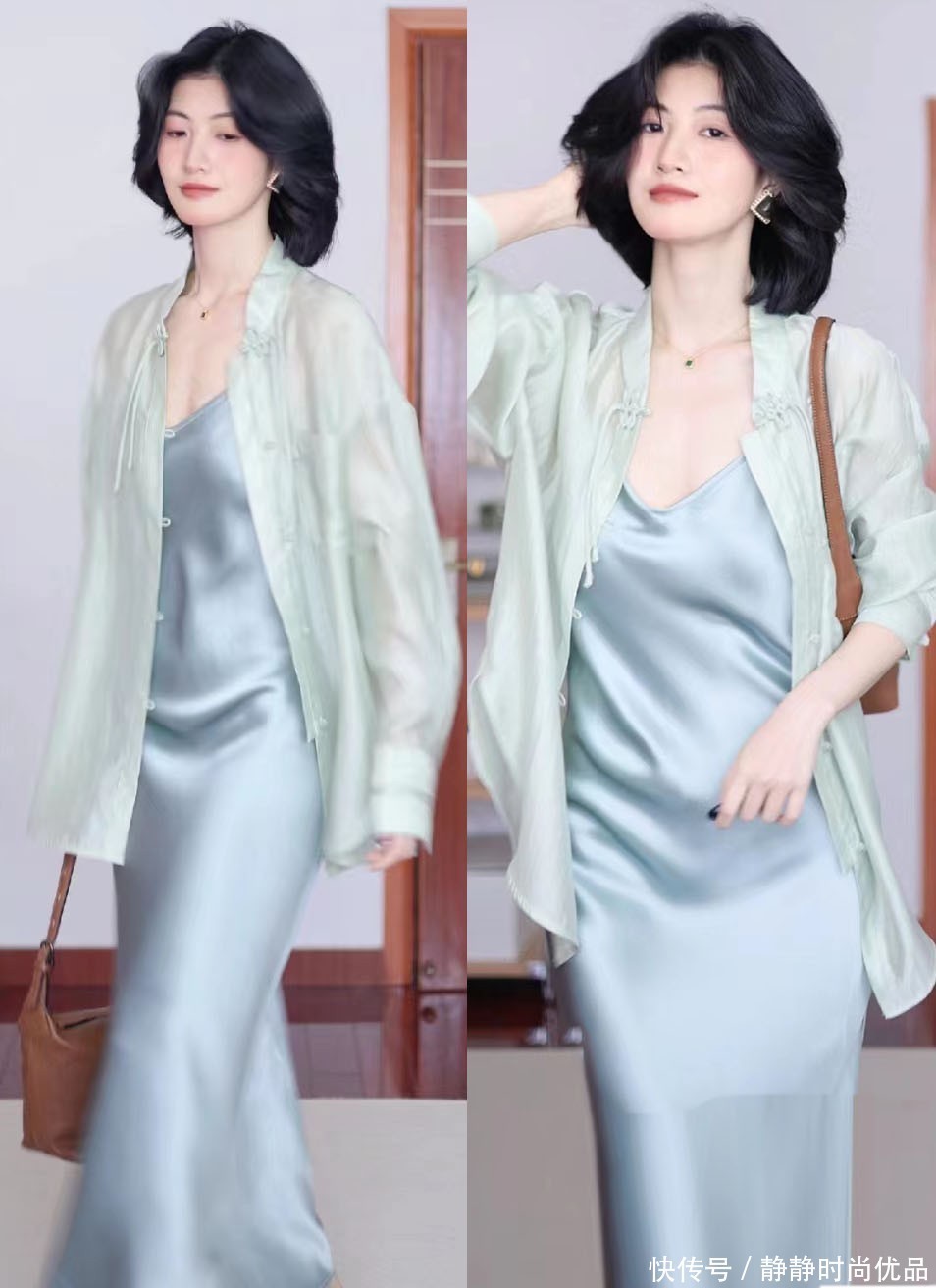 丝绸材质的长裙,面料看上去十分之丝滑贵气,再结合上浅蓝色的配色,也能更快速的开释出轻柔高雅的魔力,相配显白显气质。